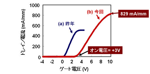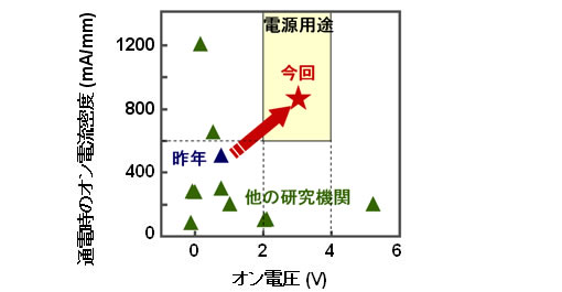今回開発したトランジスタ(図3)のオン電圧は電源装置に適用が容易な+3 Vを示し、かつオン電流密度も829 mA/mmと従来(図2の構造)よりも2倍となる高い電流値を達成しました(図4)。今回開発したトランジスタは、オン電圧+2 V以上で待機時の通電遮断を実現するトランジスタでは世界最高のオン電流密度を示しており、電源用途で必要とされる性能を満たした、世界初の窒化ガリウムHEMTとなります(図5)。