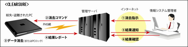 「CLEARSURE」では、本製品に内蔵する専用の通信モジュールにより、PHSネットワークを利用した遠隔操作で本製品のHDD内にあるデータをすべて消去(注1) することができます。PCが通信圏内にある場合は電源がオフの状態でもデータ消去が可能(注2)なため、PCの状態に関係なく指示を実行できるなど高度なセキュリティ機能を実現します。