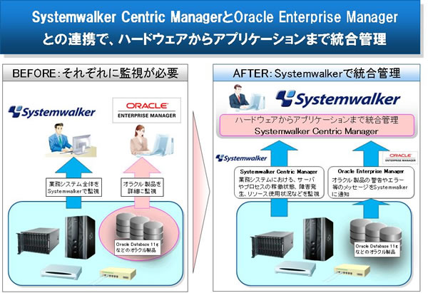 これにより、オラクル製品や富士通製品を使用中または導入を検討中のお客様は、「Systemwalker Centric Manager」と「Oracle Enterprise Manager」を併せて導入することで、ハードウェアからアプリケーションまでの一貫した統合運用管理を、少ない管理コストで実現できます。