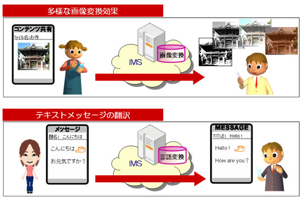 本仕様は、IMS通信方式のネットワーク内に、画像処理などのデータ処理装置を設置することにより、IMSサービスをお客様にとって更に魅力あるサービスに拡張できる技術仕様です。これにより、例えば、送信者が送った写真を、ネットワーク上で多様な画像変換を加えて相手と共有して楽しんだり、日本語のテキストメッセージを、ネットワーク上で英語に変換して相手に届けるなどのサービスが容易に実現可能となります。