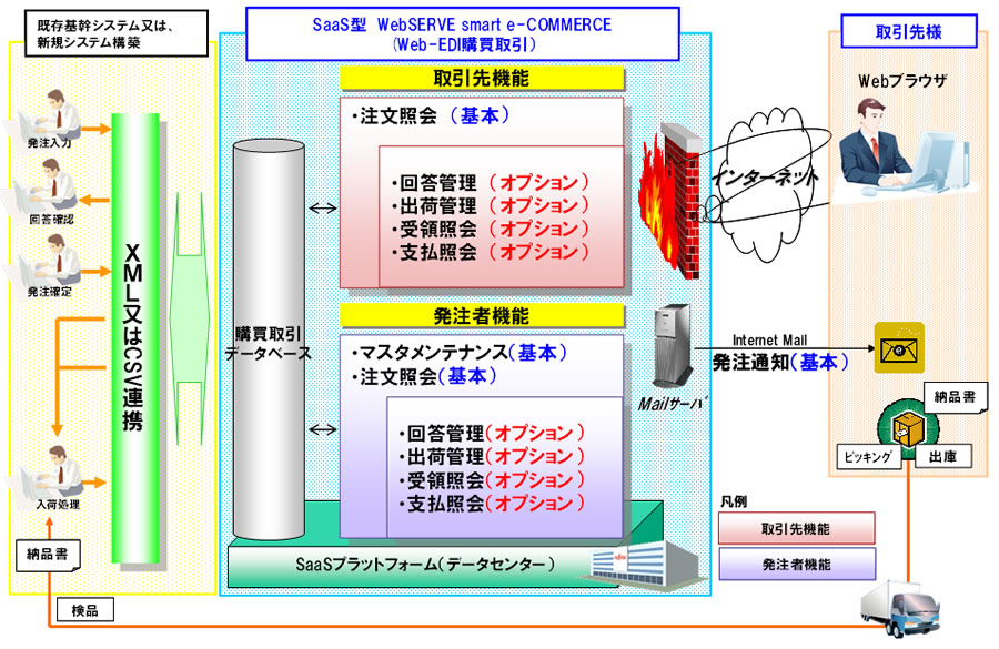 本サービスは、現在お客様が利用されている購買取引システムと、取引先のICTシステム環境の違いにより、メールやFaxなど手作業で行われていた業務をSaaS型サービスで代行するものです。これにより、お客様は、インターネットを活用しスピーディーに対応することができるシステムを短期間に実現することができます。