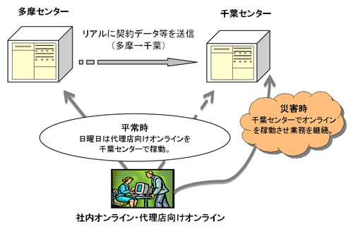 地震等の大規模災害により、東京海上日動あんしん生命の平常使用している「東京海上日動多摩システムセンター」(以下多摩センター)が稼動不能となった場合に、「東京海上日動千葉ニュータウン総合センター」(以下千葉センター)にて、社内オンライン・代理店向けオンラインを稼動させます。
