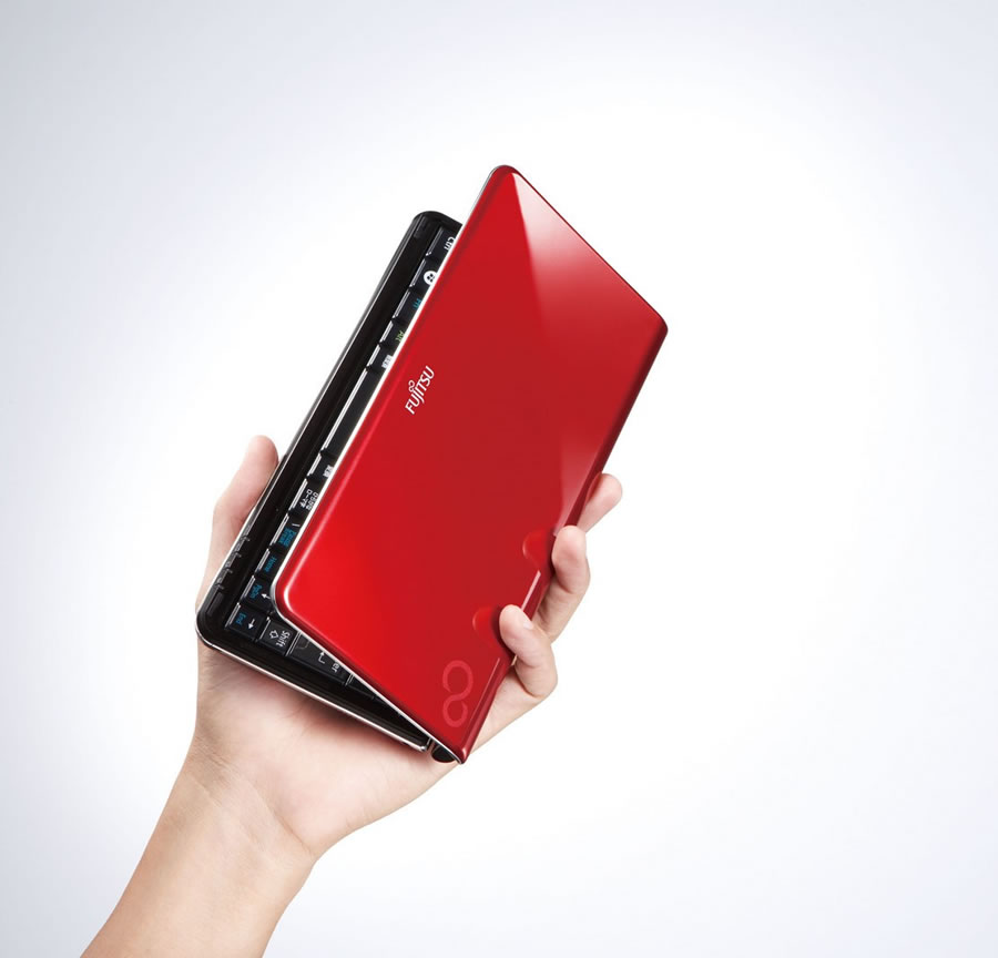 LOOX Uシリーズ拡大イメージ ポケットに入れて常に持ち運びできるように、軽さやサイズにこだわり、約495gの超軽量や、幅204mm×奥行き106.5mmの小型サイズを実現するReal Pocket size PC「LOOX Uシリーズ」を新規に提供します。お客様の利用シーンを考えて、立ったままでも操作ができるように「Windows® タッチ」機能を搭載するとともに、