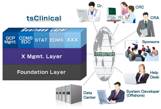「tsClinical」は、業務支援(Business Layer)、横断的マネジメント支援(X management Layer)、サービス基盤、データ基盤(Foundation Layer)の3層構造から構成されております。