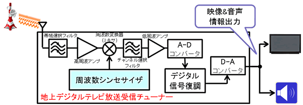 テレビや携帯電話で用いられるチューナーの内部では、放送局から送られてくる電波を受信し、映像や音声の情報を取りだしています。放送局から送られる電波はそれぞれチャンネルによって周波数が異なるため、視聴者が望む周波数チャンネルの情報を受信するには、その周波数に対応したクロックを生成する周波数シンセサイザが必要になります(図1)。