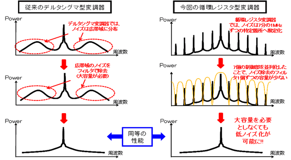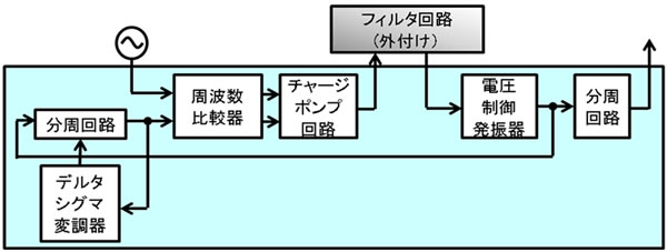 地上デジタルテレビ放送受信チューナーは、携帯電話などでのワンセグ視聴のため、小型で消費電力の少ないものが求められています。また、裏番組録画やチャンネルスキャンの高速化などのために、ダブルチューナーの搭載も期待されています。従来、チューナーの主要な部品である周波数シンセサイザは、デルタシグマ型変調器による小数逓倍方式が主流でした。しかし、この方式は、チューナーの受信感度を劣化させるノイズを抑制するための外付けのフィルター回路が必要であり、モジュールを小型化することが困難でした。また、ダブルチューナーにするには、外付けのフィルター回路が2組必要となるため、さらにモジュールが大きくなってしまいます。