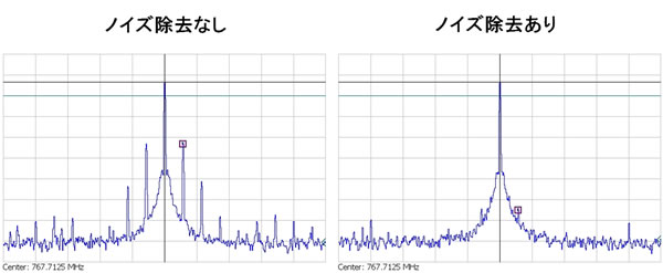 今回開発した技術により、周波数シンセサイザへの外付け部品が不要となり、回路自身の面積を従来に比べ3分の1に小型化しました。開発した技術の効果を確認するために、65ナノメートルのCMOSテクノロジーを用いて周波数シンセサイザを試作しました(図5)。試作した周波シンセサイザでは、ノイズが無視可能なレベルまで除去されていることがわかります(図6)。