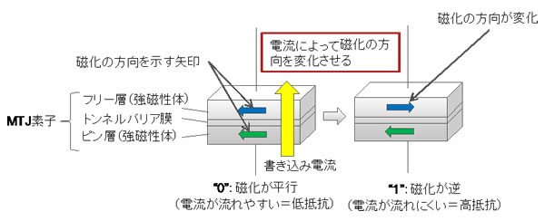 スピン注入型MRAMは、MTJ素子(注5)などの磁性材料に電流を流すことで磁化の方向が反転する現象を利用した記憶素子です(図1)。電流を流した際に磁性材料の磁化の方向が平行になったり逆になったりすることで、素子が低抵抗と高抵抗になる現象を、デジタル情報の“1”と“0”として対応させることで、不揮発性の磁気メモリとして利用しています。