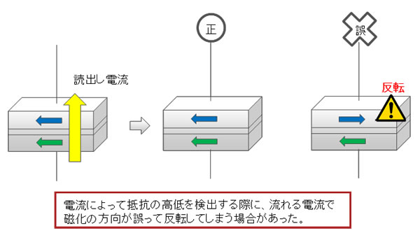 スピン注入型MRAMの読み出し時には、磁性材料に電圧をかけ、流れる電流によって素子の抵抗値が高い(“1”)か、低い(“0”)かを調べます。抵抗値の高低を正しく判定するためには、素子に高い電圧をかける必要がありました。この電圧によって流れる書き込み電流と読み出し時の電流の差が小さいことや、MRAMの素子特性のバラツキによって、読み出すつもりで流した電流によって磁化の方向が反転する誤書き込みが課題となっていました。