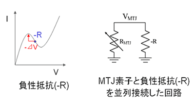 開発した読み出し方式には、MTJ素子に対して、素子の高抵抗値と低抵抗値の中間の値の負性抵抗を並列に接続した回路を用いました(図4)。この回路は、MTJ素子が高抵抗の場合には負性抵抗としての特性を示し、低抵抗の場合には通常の抵抗としての特性を示します。この特性によって、従来よりも低い電圧で抵抗の値を読み出すことが可能になり、読み出し時に磁化の方向が反転しないように制御することができるため、誤って書き込むことを防ぐことができます。