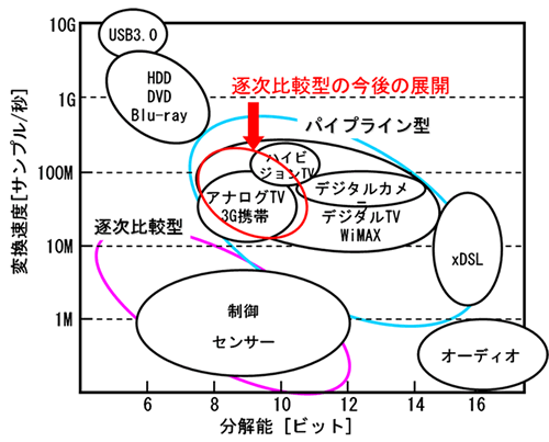 デジタル機器で主流となっているパイプライン型のA/D変換器は、アナログ回路を利用しているため、これ以上の内部回路の微細化設計が困難になりつつあり、今後も進む微細化プロセスに対応するために代替方式が必要とされていました。これに対して、逐次比較型のA/D変換器は、内部に複雑なアナログ回路を必要とせず、電力効率や小面積化に有利で、微細化プロセスに向くという長所を持つ反面、製造時の素子特性のばらつきにより高速化が難しい方式であるため、10メガサンプル/秒以下の比較的低速領域で使われてきました(図1)。そのため、素子特性のばらつきに配慮し、逐次比較型A/D変換器を高速化することができれば、低消費電力化および小型化が実現でき、さらには将来的な微細プロセスへの適用も容易です。