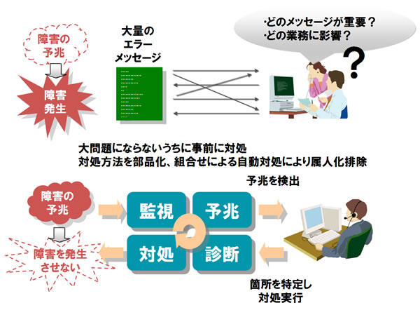 このたび、クラウドシステムからの情報分析力と情報収集力を向上させることにより、クラウドシステムの障害予兆の検知から障害原因の絞込み、さらに障害解決までの一連の処理を自動で実行する技術を他社に先駆けて開発しました。