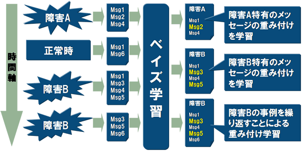 障害時には直前に出力されるメッセージに特定のパターンがあることに注目し、障害の予兆を検知します。発生したメッセージと過去に発生した障害時のメッセージのパターンを比較することで、障害の予兆が発生しているかどうかを判断します。過去に発生したメッセージパターンはベイズ学習(注2)により事例ごとに重みづけを行うことにより、障害の予兆が発生しているかどうかを高い精度で検知します。
