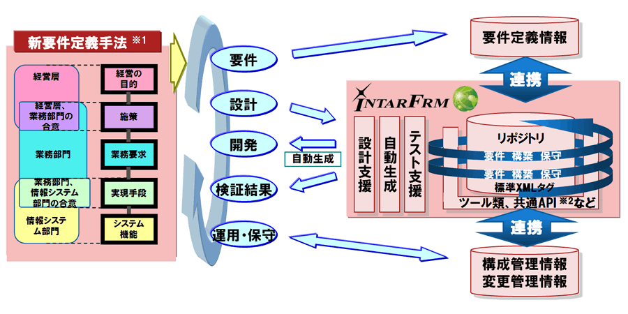 システム開発者は、「INTARFRM」を活用することで、ビジネス環境の変化に迅速かつ柔軟に対応し、より早く効率的にシステムを構築し、保守することができます。また、要件定義から設計・開発・運用・保守にいたるソフトウェアライフサイクルにおいて首尾一貫した手法で、お客様のソフトウェアや資産を継続的に発展させ、お客様のビジネス強化につなげていくことができます。