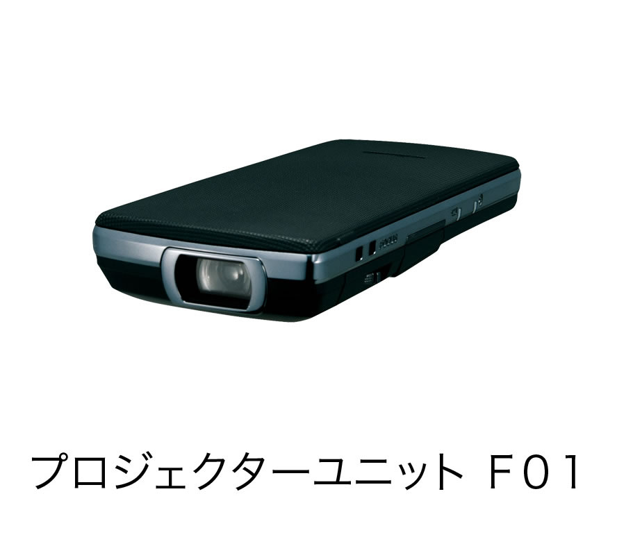 ディスプレイユニットにプロジェクターユニット「F01」(別売)を接合することにより、ワンセグや写真、動画などを投影し、最大66インチの大画面で楽しむことができます。二人で同じ画面を見ながらケータイの対戦ゲームをしたり、PCドキュメントなどのビジネス文書を会議で見たり、利用シーンをさらに広げることができます。また、デジカメやパソコンと接続すれば普通のプロジェクターとしての利用が可能です(注5)。