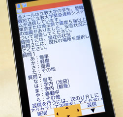 立教大学(東京都豊島区、総長:吉岡 知哉)は、災害発生時の安全確保対策として、2010年4月1日より、携帯電話を活用した「安否確認サービス」を、学生および教職員約2万名に対して運用開始しました。