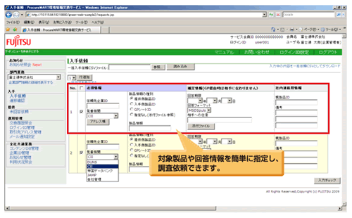 なお、「ProcureMART環境情報交換サービス」は、富士通グループが提供している環境貢献ソリューションの一つです。富士通グループでは、お客様の環境負荷を低減するプロジェクト「Green Policy Innovation(グリーン・ポリシー・イノベーション)」を推進しており、本サービスはその一環として、お客様と社会全体の環境負荷低減に貢献していきます。