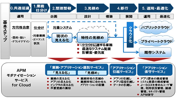 クラウド・コンピューティングの利用が始まり、お客様は現在利用している業務システムの中で、何をクラウド・コンピューティングに移行できるかという課題に直面しています。たとえば、利用中の業務システムとクラウド・コンピューティングに移行した後の業務システムの間で、OSやデータベースなどのミドルウェアに機能差が生じた場合、システムが正しく動作しないことがあります。また、アプリケーションが業務間で複雑に連携している場合、クラウド化する範囲を明らかにすることが困難です。こうした課題を解決するため、当社はクラウド化支援サービスとして「APMモダナイゼーションサービス for Cloud」を提供し、お客様にクラウド環境をスムーズに活用いただけるよう支援してまいります。