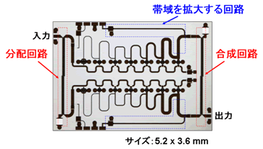 超広帯域で電力分配と電力合成をおこなう回路を開発し、半導体基板上に作り込みました(図2)。これにより、広い周波数で出力を2倍に高めることができます。