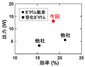 今回開発した窒化ガリウムHEMTを用いた増幅器により、6~18 GHzという広帯域において出力12.9W、効率18%(注6)を実現しました。これにより、従来の超広帯域・高出力増幅器に比べ出力を2倍に向上し、世界最高の性能を実現しました(図3)。