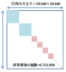 19,640にも達して要素が多すぎるため、一般的な計算機では実用的な時間で処理することが不可能でした(図3)。スパコンを利用することで、図4に示す計算時間で解くことに成功しました。今回、T2Kオープンスパコンの128ノードを使用して計算し、使用したメモリ量は4テラバイト、コア数は2,048コアです。