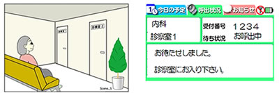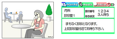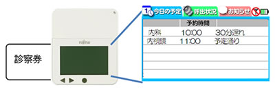 これにより、外来患者は、診察までの待ち順番の状況や呼び出しを、表示と合わせて音と振動で知ることができるため、病院内の無線通信エリア内であれば、待合室などの特定の場所で待機することなく、待ち時間に対するストレスを和らげ、アメニティの向上につながります。
