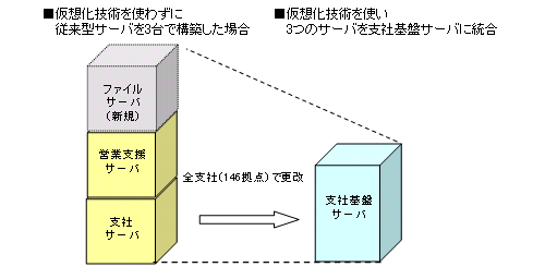 太陽生命は、これらの取り組みを推進するため、富士通のPCサーバ「PRIMERGY RX200」と仮想化ソフトウェア「VMware」を採用いたしました。複数のサーバを1台に集約できる「仮想化技術」を導入したことにより、個別に更改する予定であった「営業支援サーバ」と新たに導入する予定であった「文書ファイルサーバ」を「支社基盤サーバ」に統合することができました。