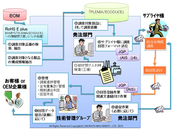 上記のニーズに対応するため、当社は化学物質管理システムの構築で約110社以上の豊富な実績とノウハウをもつ株式会社富士通長野システムエンジニアリング(本社:長野市、社長:平松 敏朗)と共同で、村田機械様の情報機器事業部における化学物質管理業務のスピードや効率、品質を向上させ、お取引先様との環境情報の伝達・共有を効率的に行える仕組みを、当社の製品含有化学物質管理システム「PLEMIA/ECODUCE」を活用し、わずか3ヶ月で構築しました。