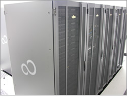 本スーパーコンピュータシステムは、最新のブレードサーバ「PRIMERGY BX922 S2」を計算ノードとした、300ノードからなるPCクラスタシステムです。最新のインテルXeonプロセッサー X5650をノードあたり2CPU、合計600CPU搭載し、理論ピーク性能は38.3テラフロップスです。ノード間の通信を行うインターコネクトには、4GB/sの転送性能を持つネットワークインターフェースであるInfiniBand QDRを採用しており、高性能な並列演算を実現しています。