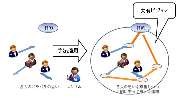 そのため、メンバー各自の思いを第3者がきちんと引き出し、それをプロジェクトの共有ビジョンに反映する手法が求められていました。