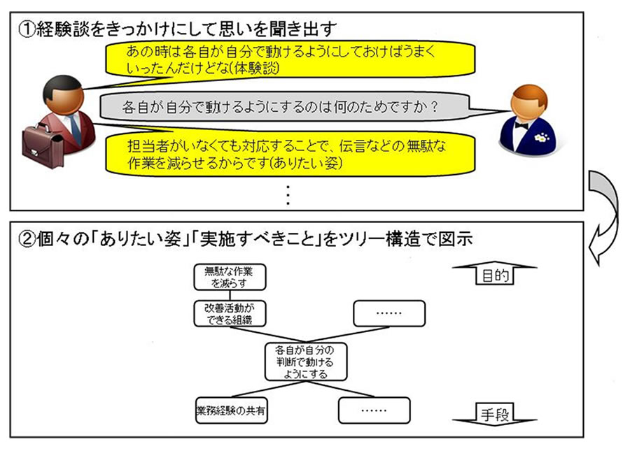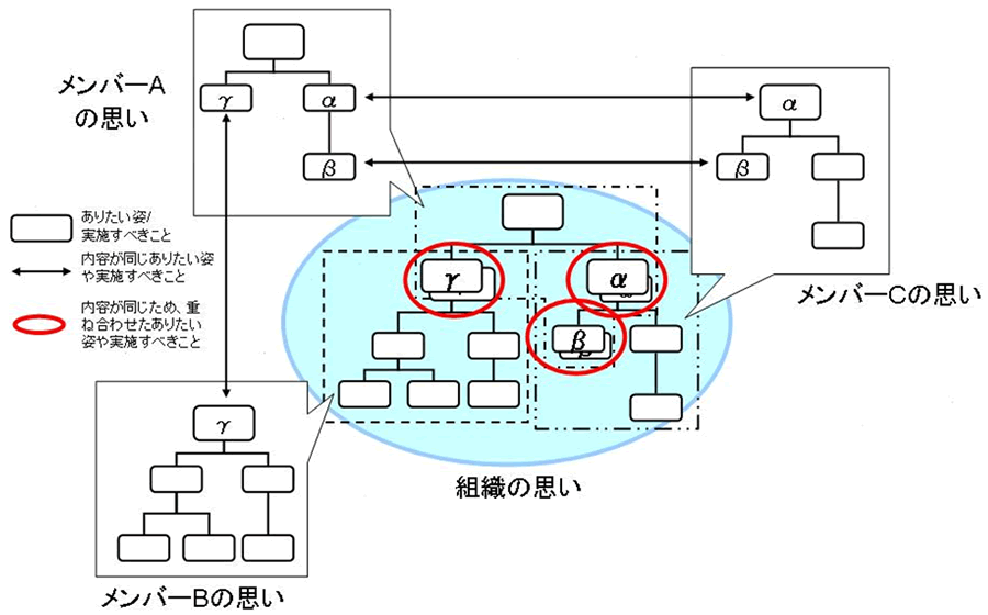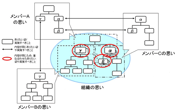 メンバーへのインタビューから得られた「何のために行っているのか(ありたい姿)」と「それを実現するには何をすべきか(実施すべきこと)」を目的や手段の関係として図示します。図では上位にありたい姿、下位に実施すべきことを表記して、内容によっては階層的に表現します。さらに、内容が同じものについては、異なるメンバーのものを重ね合わせます。これにより、分析者が、メンバーの納得できる「ありたい姿」と「実施すべきこと」を容易に見つけることができます。