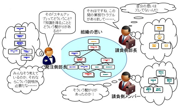 今回の手法を適用した2つの大きな組織間での事例を説明します。まず、アウトソーシングを委託した依頼元の会社と、それを請け負ってその業務の効率化を目指していた受注側の会社の間では、作業の進め方についてお互いに相手の主張している目標や主張が十分理解できていない状態でした。