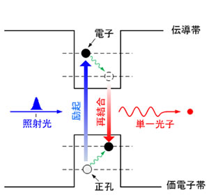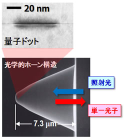 今回開発したのは、量子ドット(注6)と呼ばれるナノメートルサイズの半導体微結晶から、波長1.5μmの単一光子のみを高効率に生成させる技術です。量子ドットを、光学的ホーン構造(注7)(図1(a))の中に配置し、さらに量子ドットの離散化したエネルギー準位の1つに光照射の波長を精度良く合わせることで、電子と正孔1組のみを確実に生成する制御技術を確立しました(図1(b))。これにより単一光子生成効率が5.8%、ノイズとなる複数光子の同時発生確率が減衰レーザ光の約20分の1といずれも光通信波長帯で最も高性能な単一光子源を実現しました。
