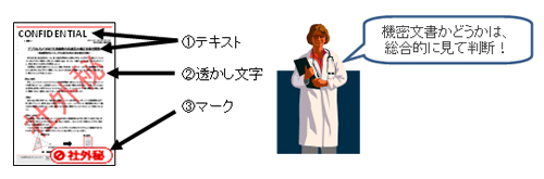 従来のようにテキスト情報からの特定文字列(社外秘など)の検出だけでなく、マークや透かし文字も検出することで、高い精度で機密文書と判断することが可能になります。