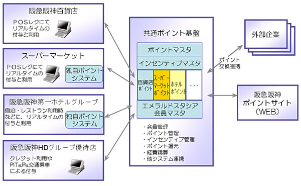 阪急阪神ホールディングス株式会社(本社:大阪市北区、社長:角 和夫、以下、阪急阪神HD)様とエイチ・ツー・オー リテイリング株式会社(本社:大阪市北区、社長:若林 純、以下、H2O)様は、阪急阪神グループで共同展開している「阪急阪神エメラルドSTACIA(スタシア)カード」をはじめとする各種STACIAカードやH2Oグループの発行するポイントカードにおいて、ポイントの合算・即時利用などの新サービスを実現するグループ共通ポイントシステムを当社と共同で構築し、10月より、阪急阪神共通ポイントサービスを拡大されます。