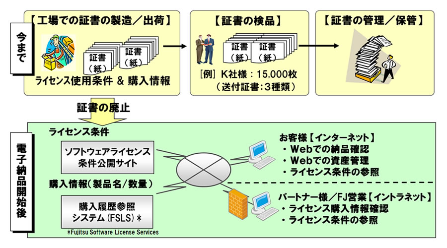 ソフトウェアライセンスの納品におけるお客様の作業負荷軽減、および昨今の社会的な環境意識の高まりと当社グループの環境負荷低減プロジェクト「Green Policy Innovation(グリーン・ポリシー・イノベーション)」をうけて、このたび、当社製のソフトウェア製品のライセンス(使用権許諾)の電子納品を開始します。ライセンス電子納品は、2010年6月より一部製品を対象に開始し、本日より対象製品を拡大し、本格的な運用を開始します。