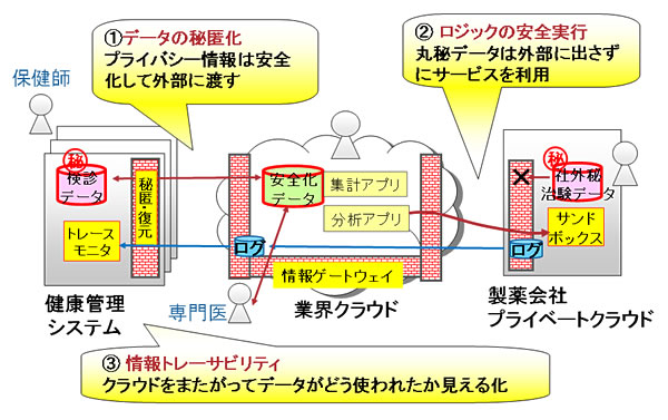 秘匿化技術により、データが情報ゲートウェイを通る際に、データの機密部分を削除や加工するなどして外部のクラウドに渡すことができます。たとえば、検診結果に含まれる個人情報をいったん別の意味のない文字列に置き換えて外部の業界クラウドに送って専門医の診断をもらい、結果を受け取る際には再び復元するといった使い方ができます。