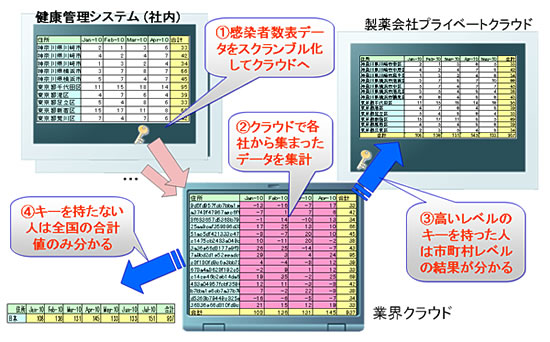 また、地域別感染者数のような機密の表データは、元の数値が分からないよう特別な暗号化を施してクラウドに送り、なおかつ複数のデータをそのまま集計することもできます(特許出願中)。集計結果は各利用者が持っている復号キーのレベルに応じた詳細度(県レベル、市町村レベルなど)で入手できます。クラウドには実際のデータやキーを置かずに処理することができ、さらに1つの集計結果を複数の利用者が復号キーレベルに合わせて利用可能なため、データベースの管理が容易という特徴があります(図2)。