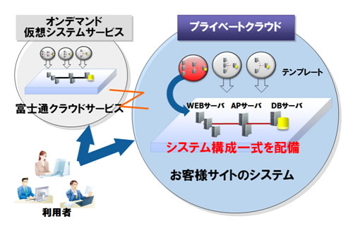 今回強化を行った製品群を使用することで、複数台の仮想サーバ(Webサーバ、アプリケーションサーバ、データベースサーバ)によるシステム構成一式をプライベートクラウドとして容易に構築できます。これは、当社のパブリック型クラウドサービス「オンデマンド仮想システムサービス(注1)」と同様の画面で操作できます。