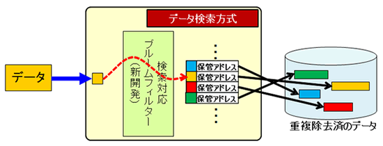 書き込むデータが、すでにストレージに格納されたデータと重複していないかを瞬時に判断し、新規のデータのみをストレージに書き込みます。重複したデータはストレージに記録されません。重複しているかどうかを効率的に判断する手法としてブルームフィルター(注2)がありますが、本技術ではブルームフィルターを検索にも対応させ、重複の判断とともにデータの保管場所の検索も瞬時に処理できるようにしました。この技術により、検索に必要な処理量を大幅に削減し、ソフトウェアだけでデータ保存と同時に重複除去を行うことを可能にしました(図2)。