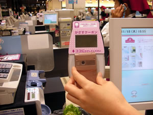 イオンマーケティングは、お客様一人ひとりの嗜好やニーズ、購買・利用履歴などに合わせた付加価値を提供し、お客様と継続的な関係を構築する「One to Oneマーケティング」の展開を強化されています。その一環として、当社のクラウドサービス「オンデマンドホスティングサービス」を活用し、2010年10月27日より、東京都、神奈川県、千葉県、埼玉県のジャスコなど47店舗で「イオンモバイルサービス」(注1)の新サービス「かざすクーポンサービス」の運用を開始しました。「イオンかざすクーポン」は、お客様が、商品を購入される際に、店頭のレジの専用端末に、おサイフケータイをかざすだけで、割引クーポンなどを利用できる便利なサービスです。