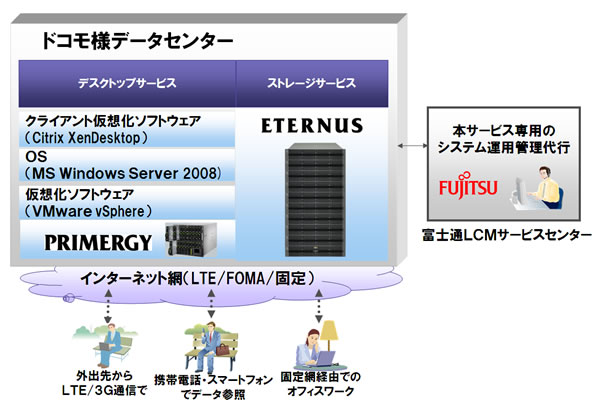 当社はこのたび、株式会社エヌ・ティ・ティ・ドコモ(本社:東京都千代田区、代表取締役社長:山田 隆持、以下、ドコモ)様が2011年2月17日より提供開始されているモバイルワーカー向けクラウドサービス「モバイルセキュアデスクトップ」を支えるICT基盤を構築しました。本サービスは、情報漏えいの懸念から、社外でのパソコン利用を厳しく制限されている企業のモバイルワーカー向けの新サービスであり、次世代通信方式LTE(注1)を活用した接続サービス「Xi(クロッシィ)®」からも利用することができます。