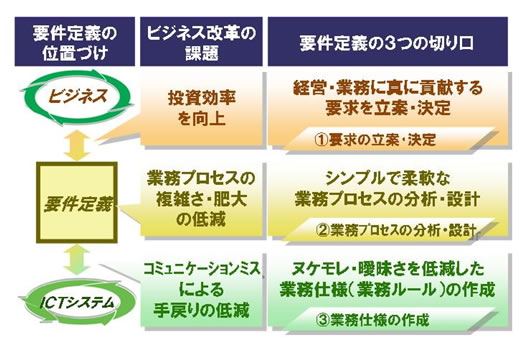 ビジネス環境の変化が激しい昨今、企業が競争優位に立つためには、どのようにビジネス改革を推進するかということがポイントとなっています。業務プロセスとシステムは、事業を支える基盤であり、変化に迅速に対応し、ビジネスに貢献できるものであることが必要です。要件定義はビジネスとシステムを橋渡しする工程であり、その重要性はますます高まってきています。
