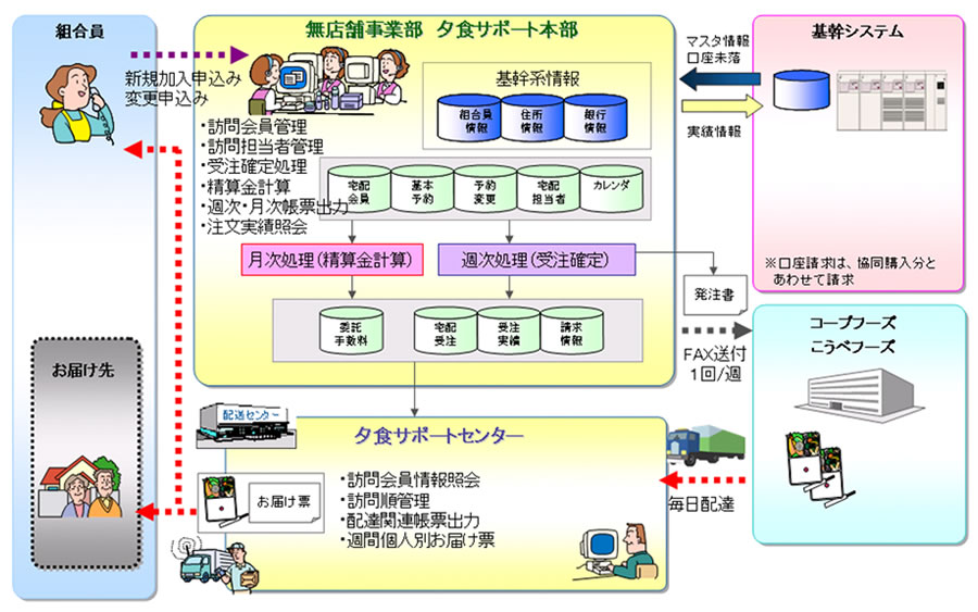 富士通は、コープやまぐち様および生協ひろしま様などで導入実績がある株式会社富士通中国システムズ(本社:広島市南区、社長:黒田 高史)の「夕食宅配ソリューション」をベースに安否確認や退会理由などの会員属性および未収金管理の機能を追加開発し、注文から発注、配達にいたる夕食宅配業務をトータルに管理支援する夕食宅配管理システムをコープこうべ様と共同で6ヶ月の短期間で構築しました。