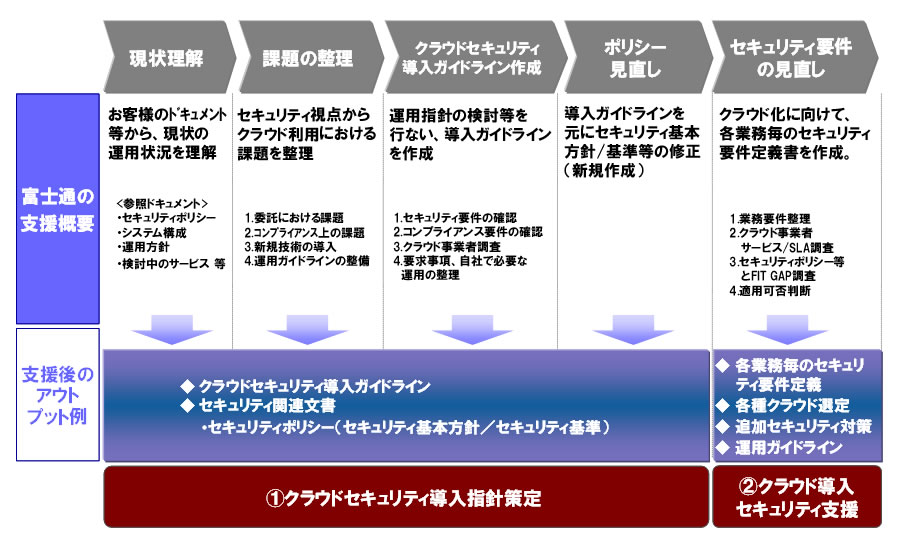 「クラウドセキュリティコンサルティング」は、クラウド・コンピューティングの導入を検討するお客様を対象に、セキュリティの観点から、ICTインフラのクラウド化に向けた課題を整理し、「クラウドセキュリティ導入ガイドライン」を策定する「クラウドセキュリティ導入指針策定」と、策定したガイドラインを元に、業務ごとのセキュリティ要件を策定する「クラウド導入セキュリティ支援」の2つのメニューからなっています。