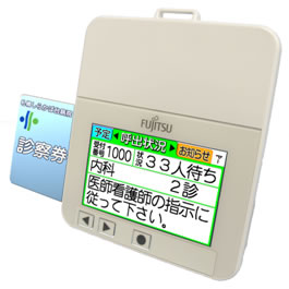 本システムは、電子ペーパーを搭載した電子カードホルダー、富士通独自の無線通信を利用し、診察室や検査室などを案内する電子カルテシステムと連携させたもので、外来の患者様一人ひとりに対し、受付から診察時の呼出し、会計までの案内情報を、きめ細かに配信します。