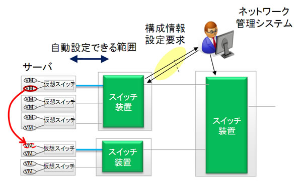 - 仮想マシンや仮想スイッチなどの情報を活用して、物理スイッチと連携することにより、仮想マシン移動時のネットワーク設定更新を自動化する技術。
