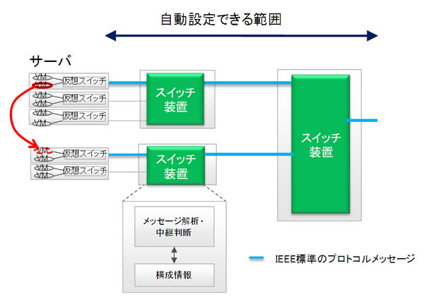 仮想サーバの移動に合わせて、必要となるスイッチの設定を自動変更します。標準化作業中のIEEE 802.1Qbg(注5)で定められた設定変更のための通信メッセージを、スイッチ装置内で動的に構築した構成情報に応じて上位のスイッチに中継する機能を開発し、それにより多段構成の上位のスイッチを自動設定することが可能になりました(図2)。