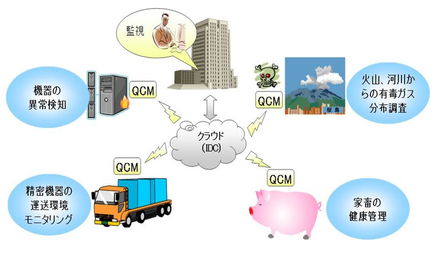 今回開発した環境モニタリング装置を利用することにより、電子機器の筐体内や屋外の移動体といった、電源や通信ケーブルが確保できない場所でも、設置場所の大気環境を遠隔地で常時監視できるようになります。たとえば、化学物質の漏洩や焼却炉からのガスの発生、火山の噴火などにより、大気環境が変化すると、リアルタイムでその影響を発振周波数の変化として測定できます。その影響が一過性か継続性かを判断することも可能なため、継続している場合は、その発生源を特定して適切に対策することができます。