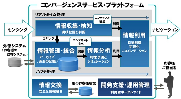 このたび、コンバージェンスサービスを実現するために必要な、ビッグデータの蓄積・分析、リアルタイム処理、データのコンテキスト処理(注1)の機能を持つ統合プラットフォーム「コンバージェンスサービス・プラットフォーム」を開発し、世界で初めてPaaS基盤として提供します。